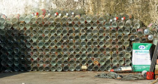 Typical street scene in Chong Lou. Interesting to note: modern signs printed on vinyl are attached to a wire frame which is attached to the building.