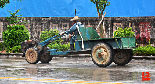 In the photo, one can see the tractor is two large wheels, motor and a steering column. The trailer attaches at the base of the motor.
