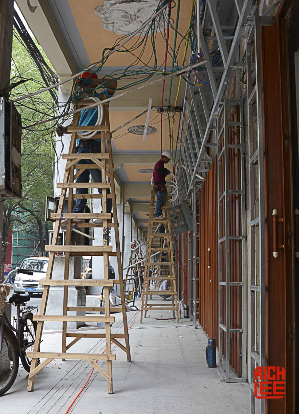 This crew is hiding the electrical wires as part of the modernization program which restores Taicheng to look like the 1880’s.