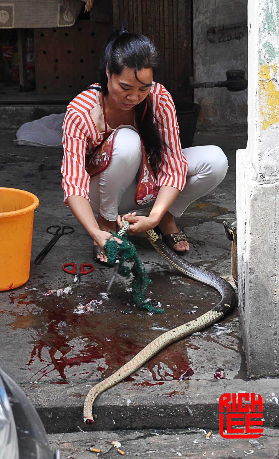This woman is skinning the snake. The snake was over six feet long. Some people believe that eating snake helps strengthen one’s back bone.