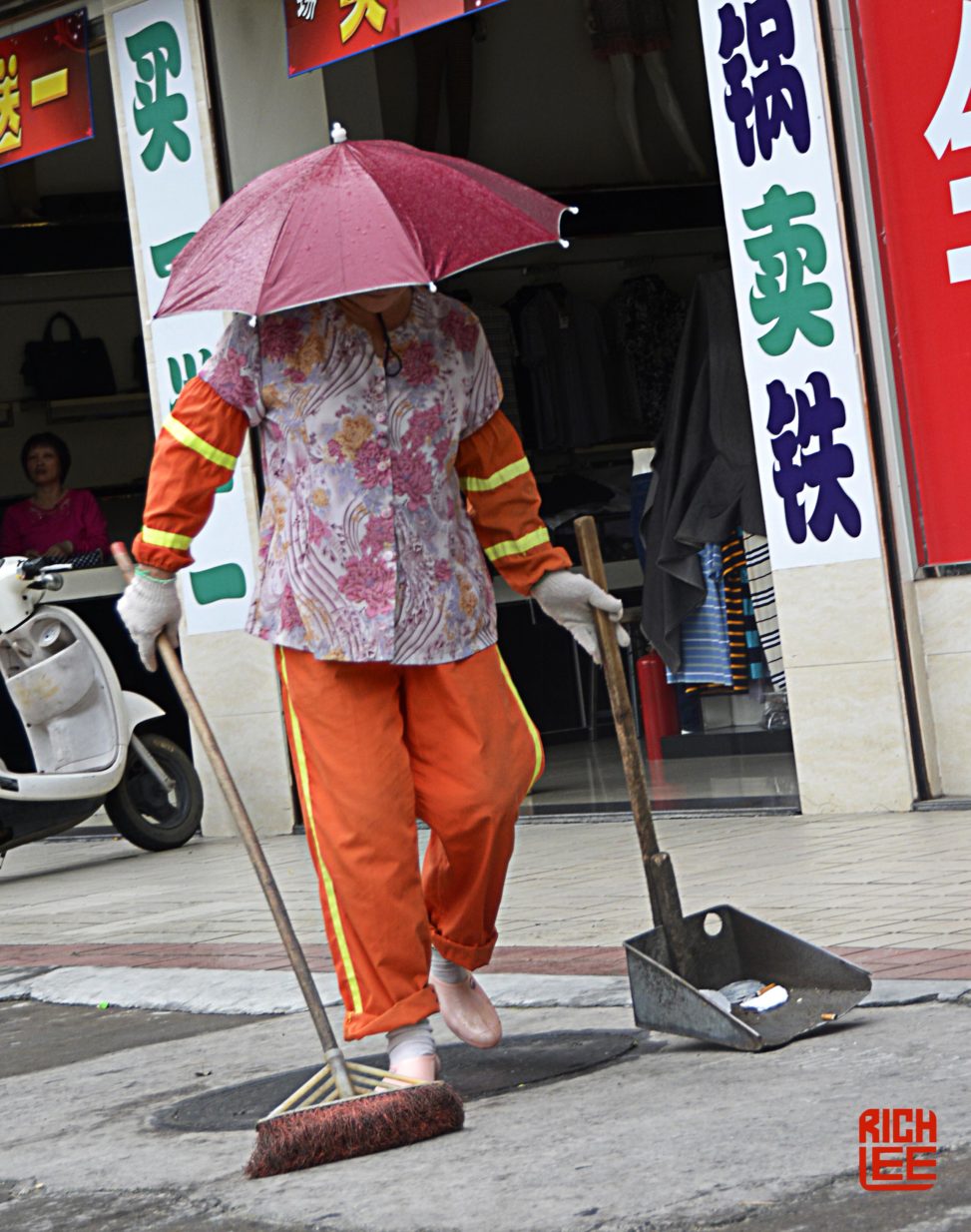 Sweeper expects to be in the sun all day which is why she wears the umbrella.