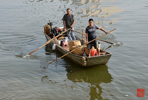 This boat is cleaning the shoreline between the ship and shore. The man standing is rowing the boat facing forward. This is so he can maneuver the boat…